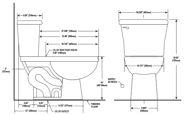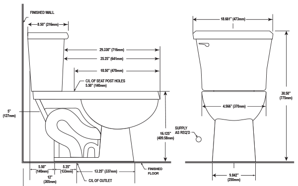 Toilet designed to rough-in at minimum dimension of 12”(305mm) from finished wall to C/L of outlet. Supply not included with fixture and must be ordered separately. Dimension shown for location of supply is suggested. For additional information, refer to installation instructions supplied.